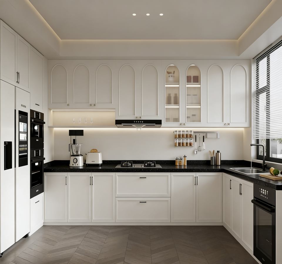 Ensemble d'armoires de cuisine modernes de style français - Éclairage LED et niches en verre, rangement élégant pour les maisons contemporaines de luxe