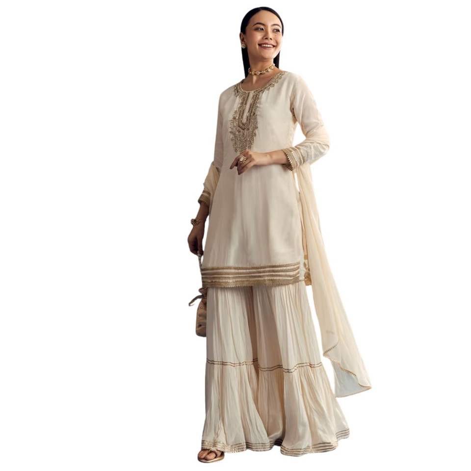 Ensemble Kurta Sharara en soie Georgette avec travail Zardosi ivoire, sans plis, pour mariage, fête, réception festive, traditionnel et culturel