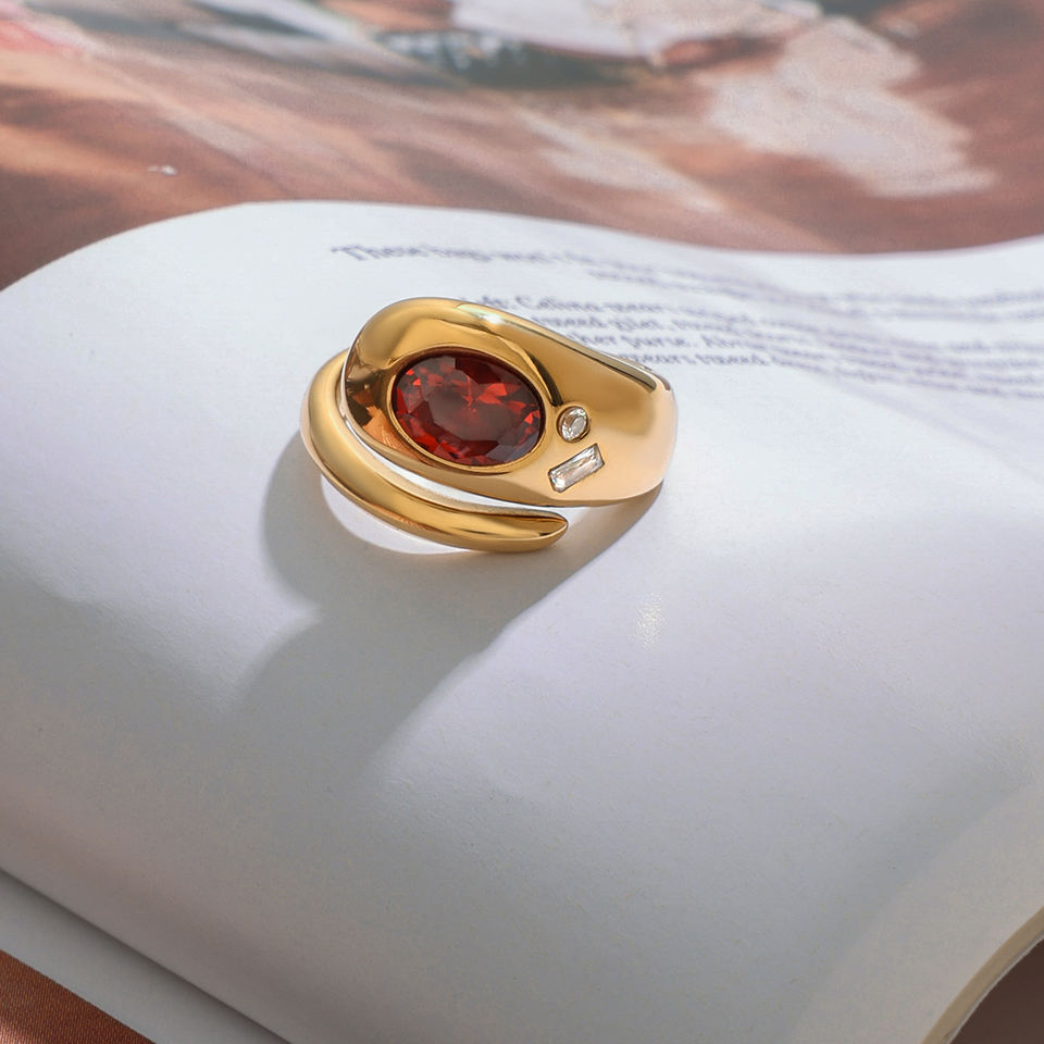 Bague ouverte en acier inoxydable plaqué or 18 carats avec zirconium rouge en forme de serpent de la série J&D