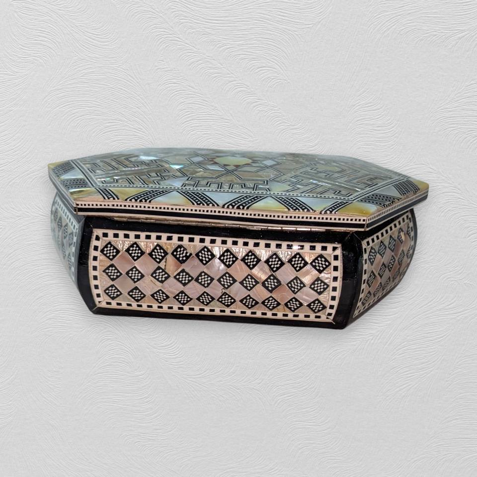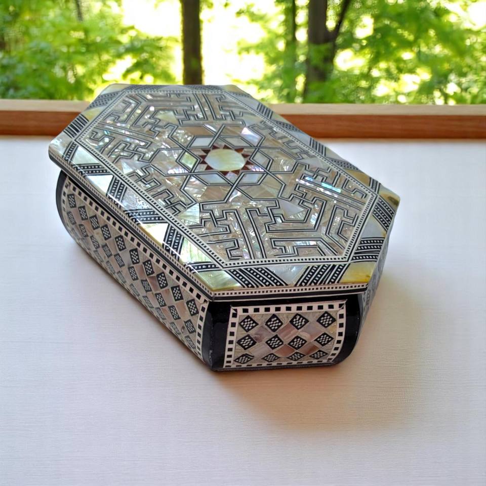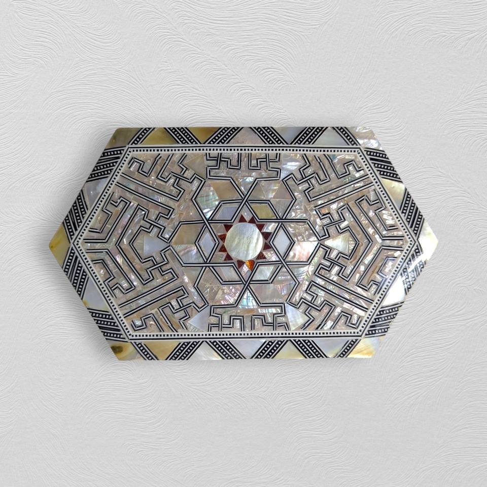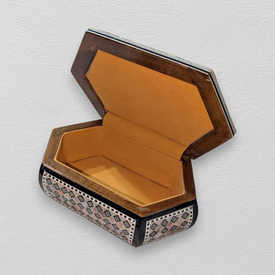 ZAHEREEN J117 Moroccan Style Modern Elongated Hexagon Mother Pearl Inlay Handmade Curved Sides Jewelry Gift Box Wood Bone