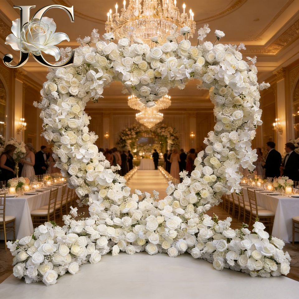 Arche de fleurs artificielles en soie réaliste faite à la main JC Wholesale, en forme de cœur, roses blanches, décoration de mariage