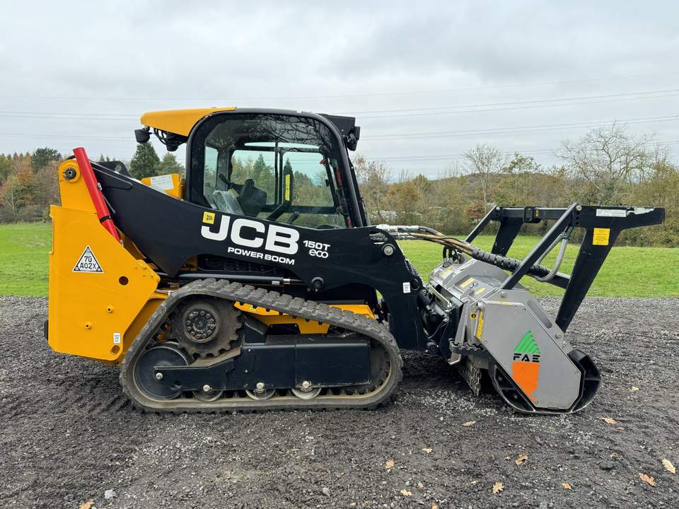 Chargeuse sur pneus JCB 150T Eco avec broyeur forestier FAE, origine américaine, puissance 37/42 kW, haute efficacité