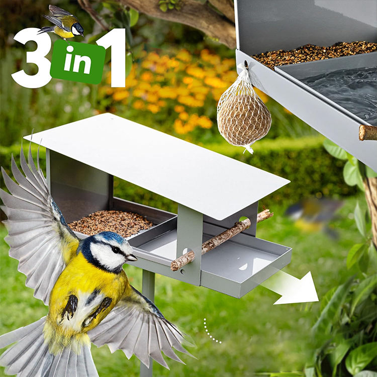 Mangeoire à oiseaux JH-Mech de haute qualité avec support durable, résistant aux intempéries, facile à nettoyer, vente en gros de mangeoire à oiseaux d'extérieur en métal gris
