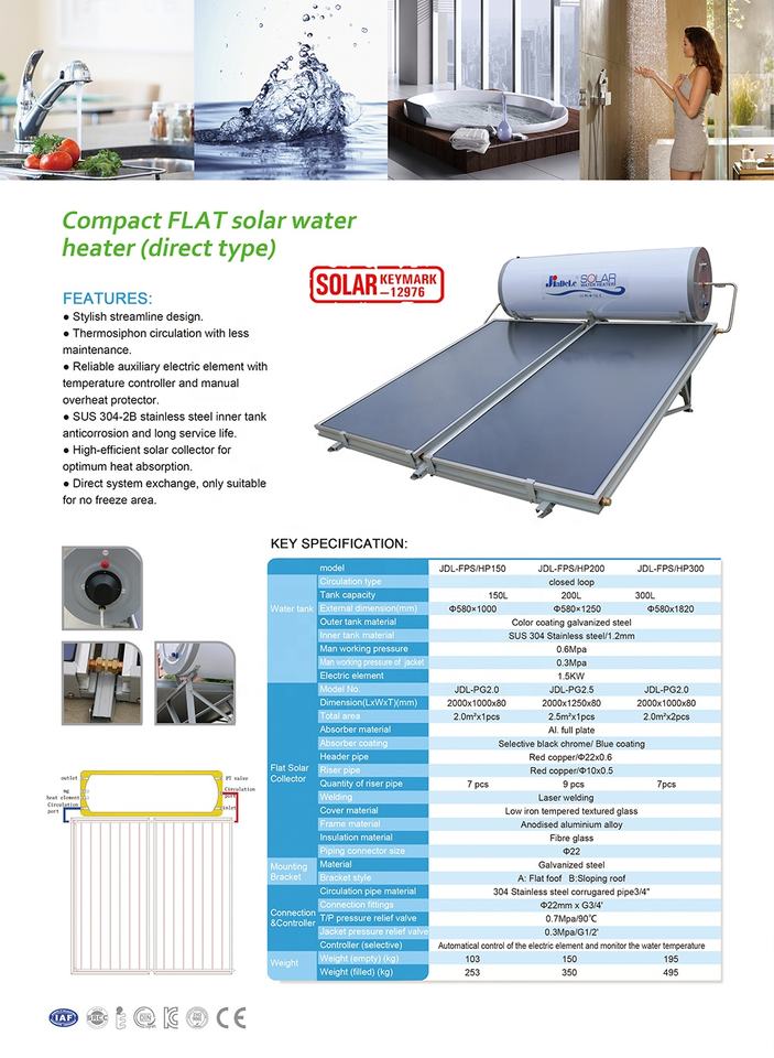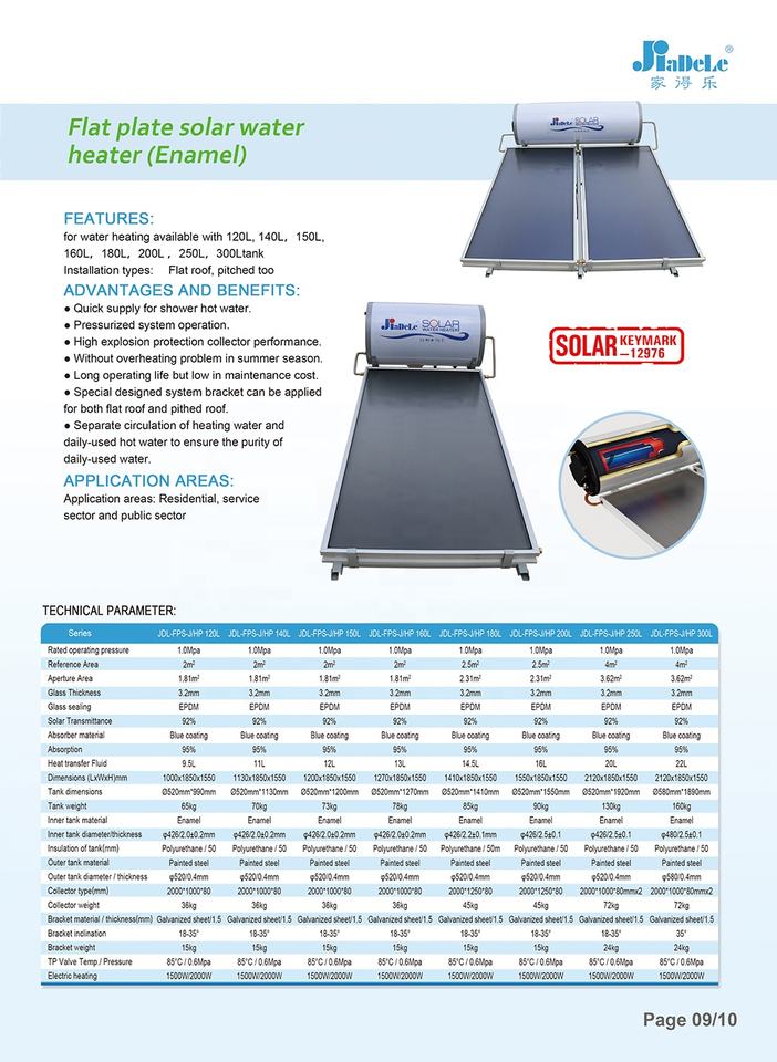 JIADELE plaque plate à haute pression à prix d'usine Calentador De Agua panneau solaire chauffe-eau en capacités 100L 200L 300L