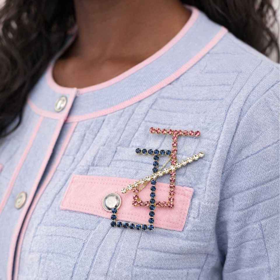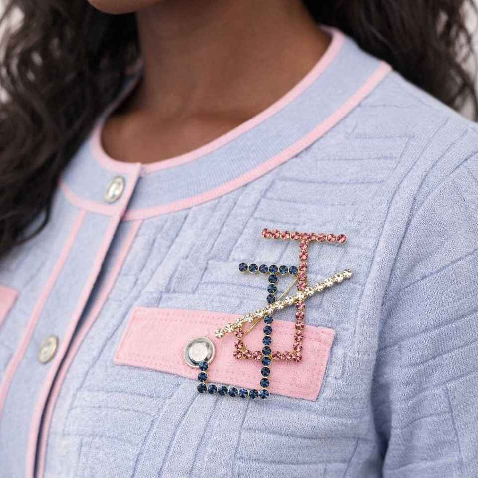 Épingle à strass JJOA rose et bleue, design J avec strass, broche élégante pour vestes et accessoires, bijou raffiné