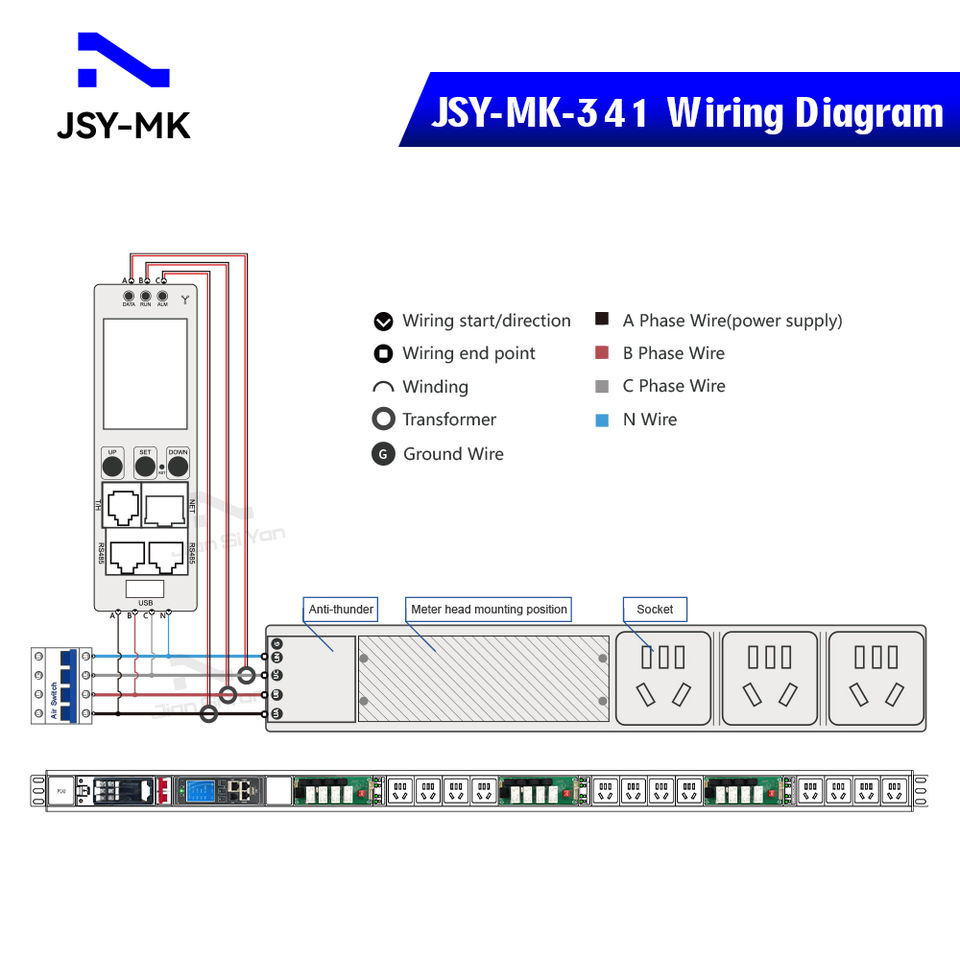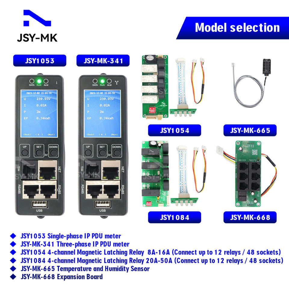 JSY-MK-341 Compteur PDU IP intelligent 63A avec carte d'alimentation intégrée et carte de contrôle de relais 16A Ethernet et TCP/IP SNMP V1/V2c/V3