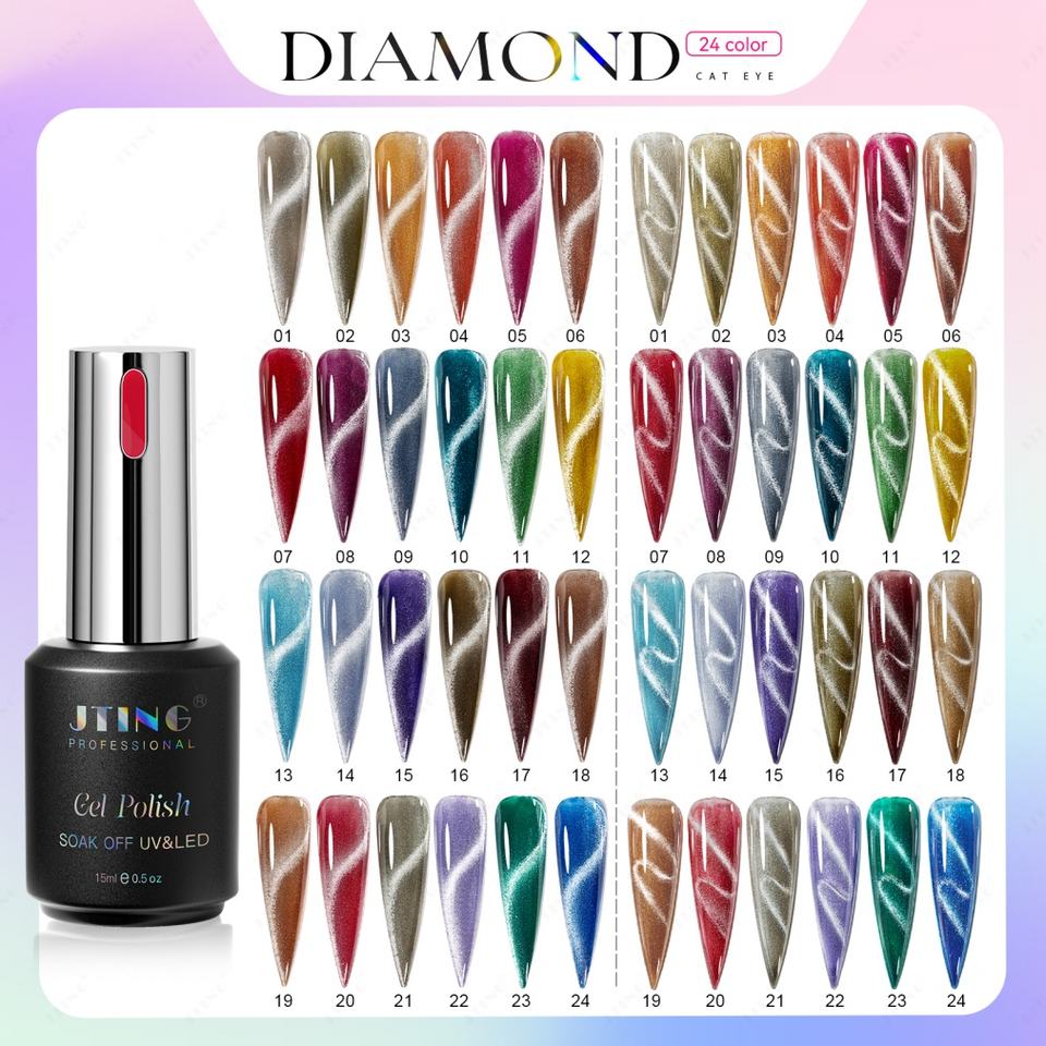 JTING Design – Collection de vernis à ongles gel effet œil de chat diamant coloré unique, coffret de 24 pièces avec livre de couleurs gratuit, fournitures pour ongles