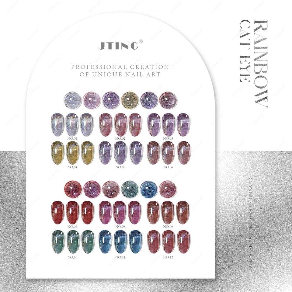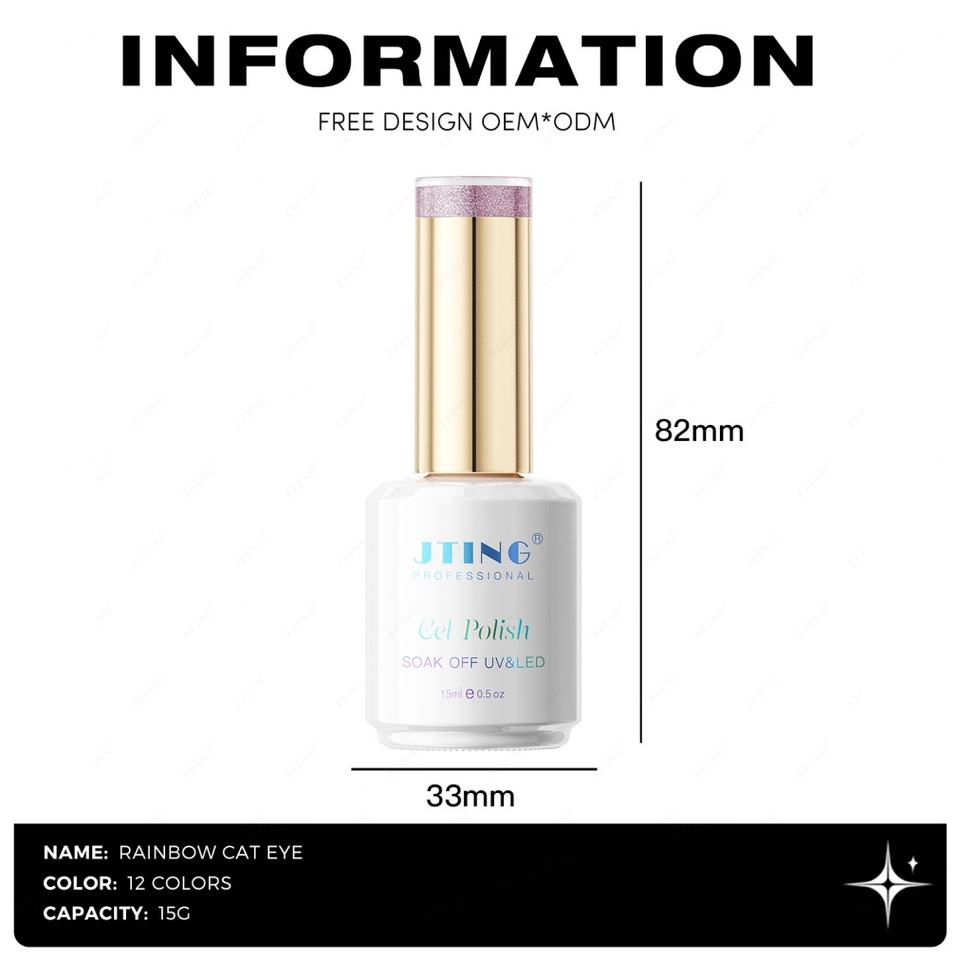 JTING Vernis Gel Effet Œil de Chat Arc-en-ciel 12 Couleurs, Conception Personnalisable, OEM/ODM, Sans HEMA ni TPO, Fournitures d'Art Ongulaire en Gros