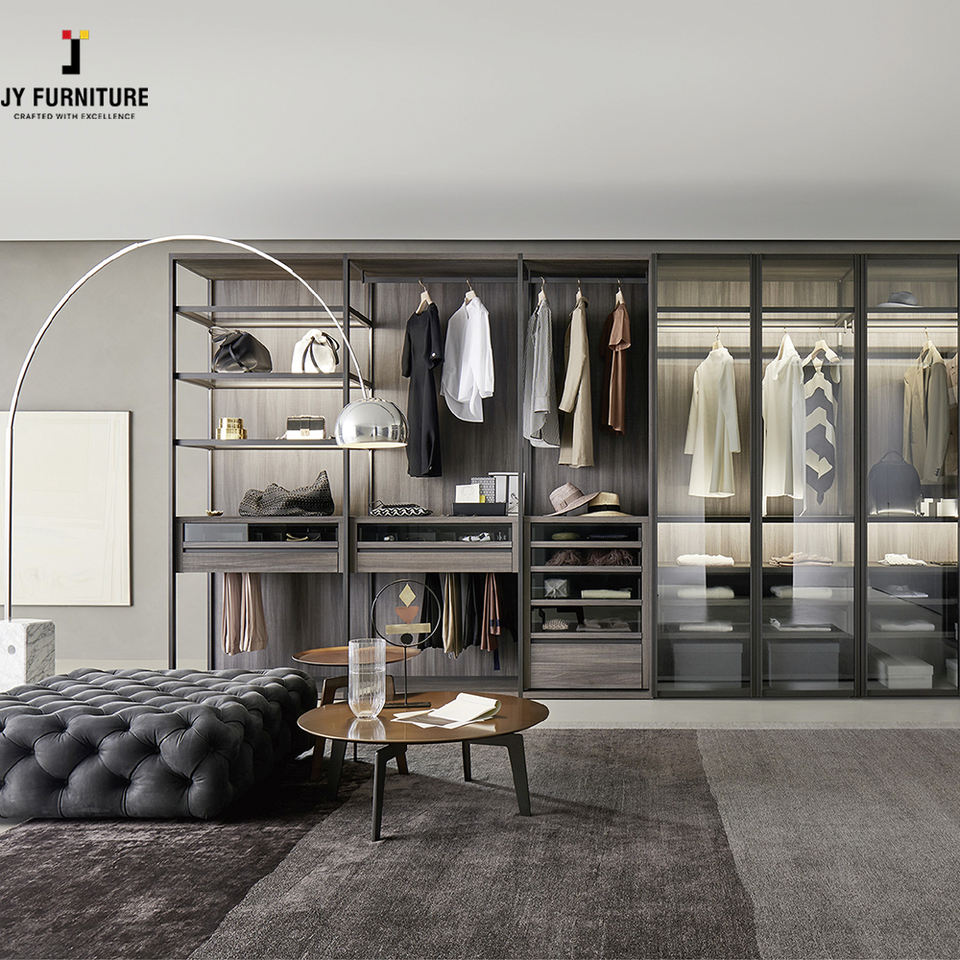 JY Furniture Elegant Design Glass Door High Gloss Soft Close Hardware Wardrobe Closet Bedroom Furniture Closet for Clothes