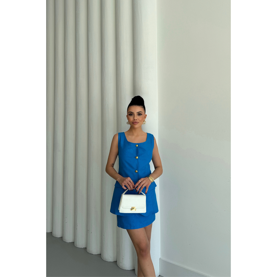 Ensemble veste en lin jacquard et jupe courte au-dessus du genou bleu - Ensemble 2 pièces pour femme taille XS avec un design élégant