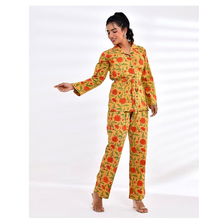 Jaipuri Designs Orange Floral Print Co-Ord Set Hand Block Print Full Sleeve Belted Top Pantalon Poches Crêpe Soie Hiver Été