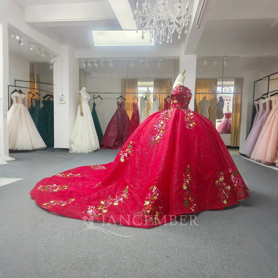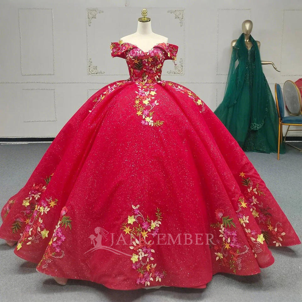 Jancember ANY19 traditionnel Bling rouge hors de l'épaule Empire Puffy robe de soirée robe de bal