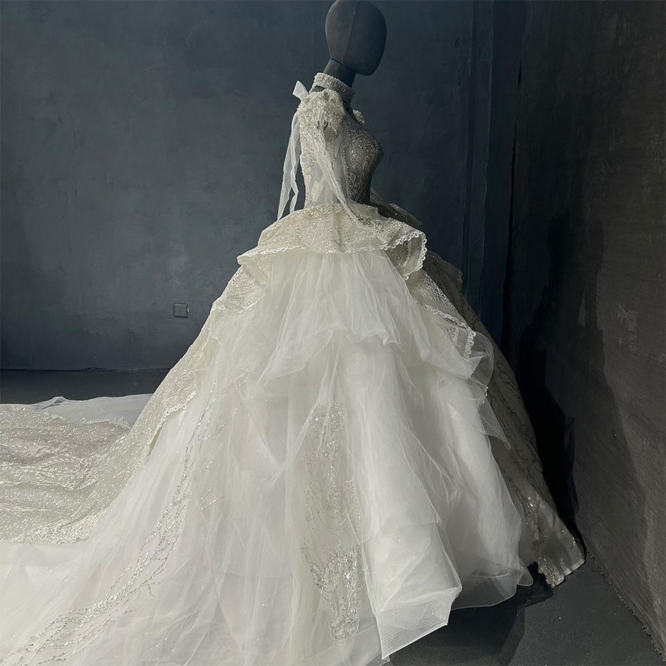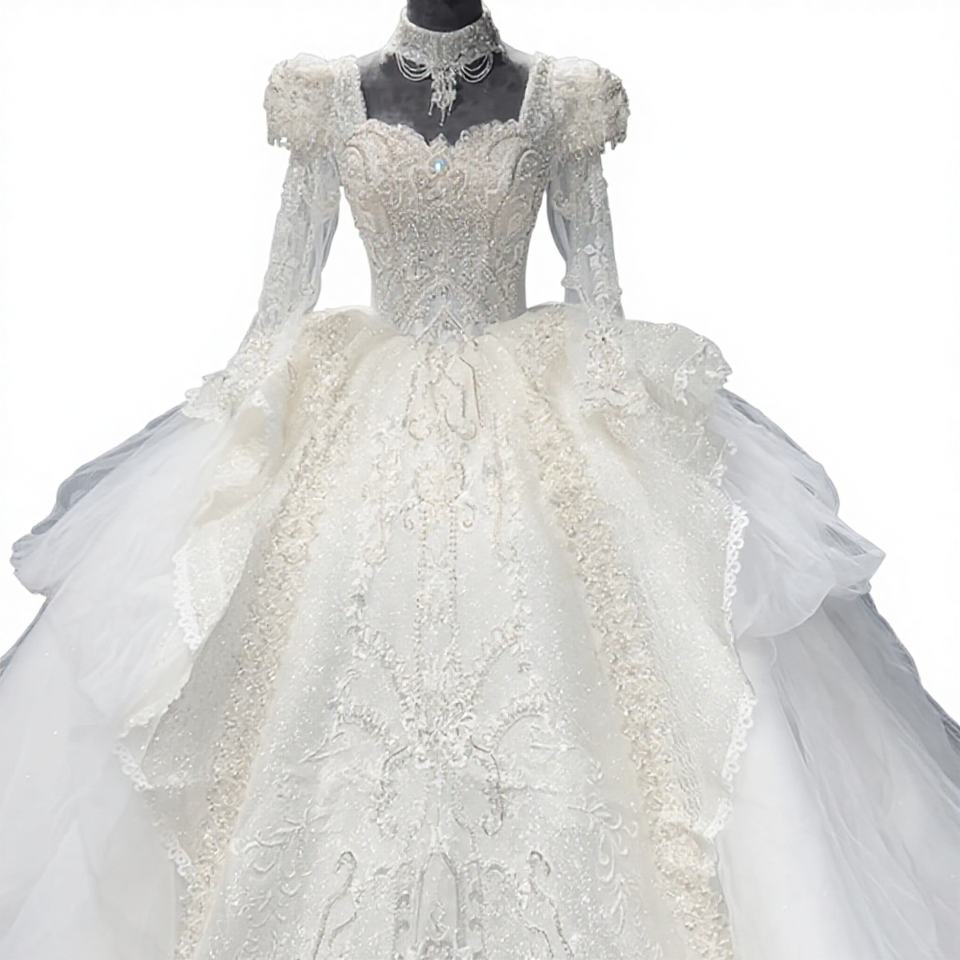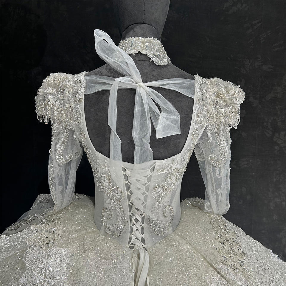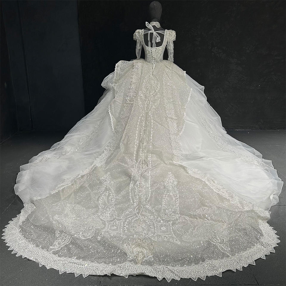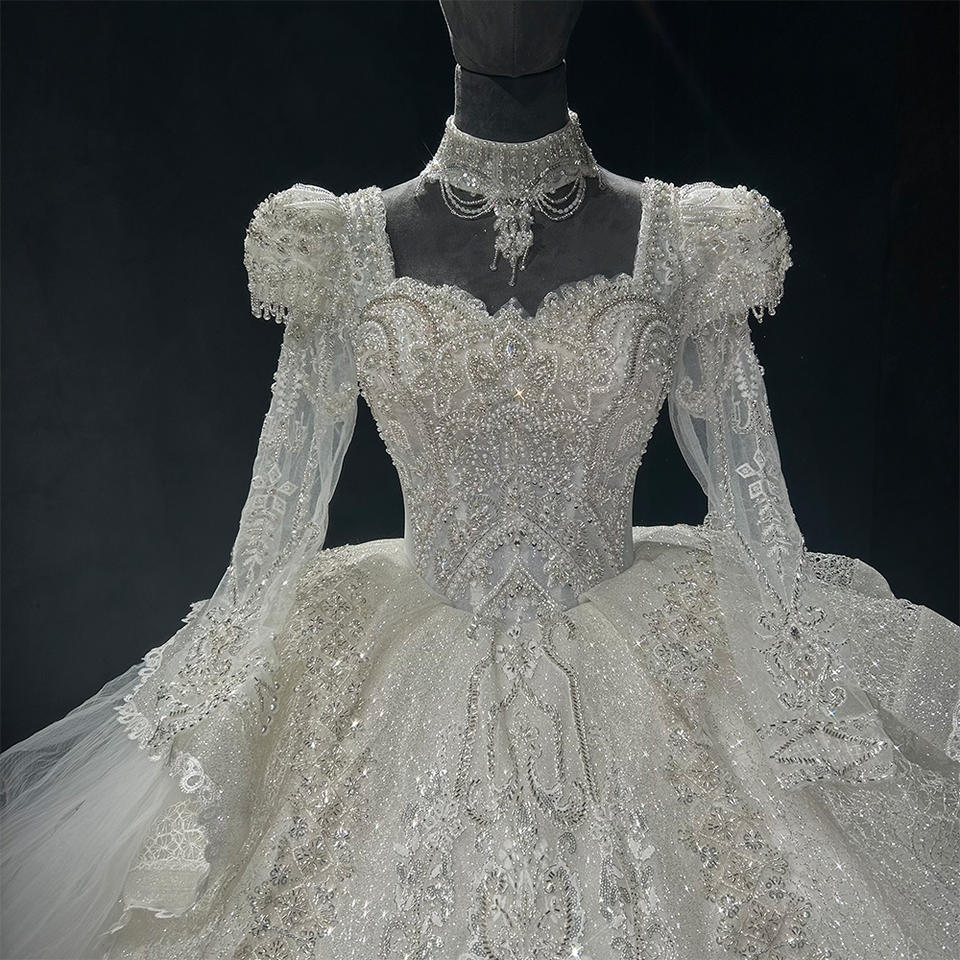 Robe de mariée moderne LSYY017 style robe de bal avec manches longues, col carré, décorations florales en dentelle et cristaux