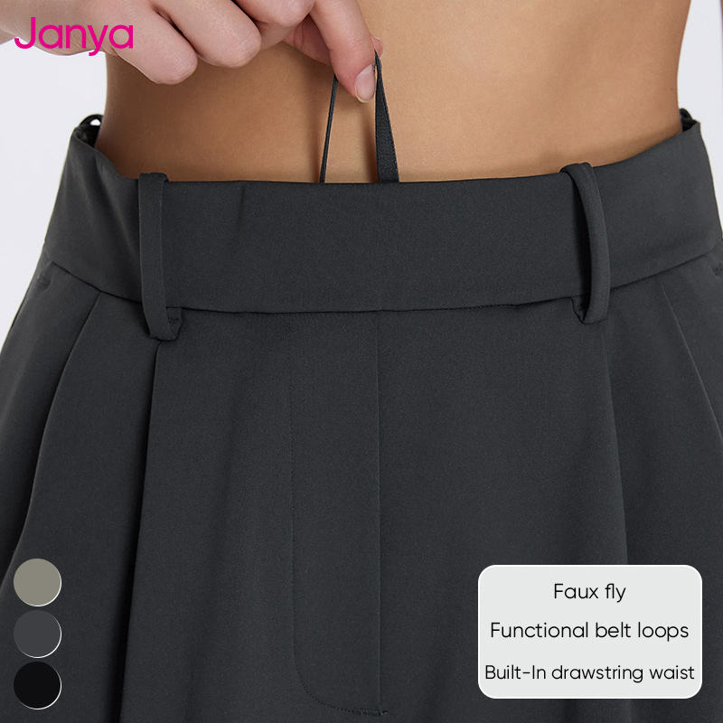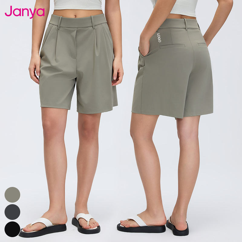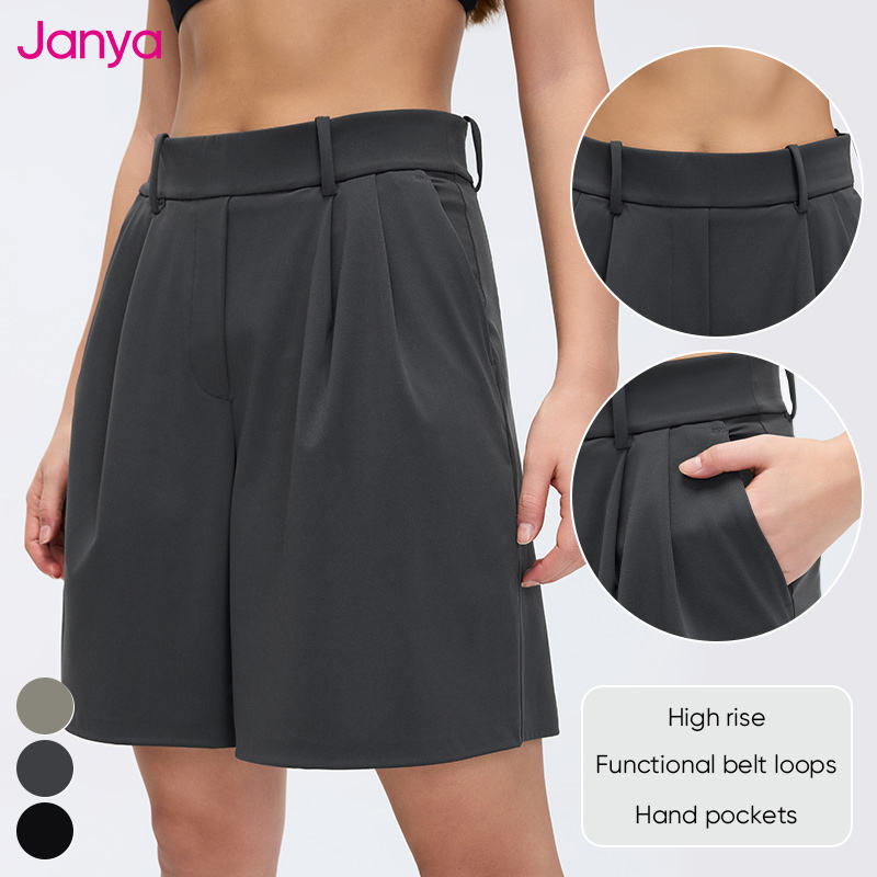 Shorts Janya en Spandex/Nylon Respirant, Couleur Unie, Coupe Droite, Jambes Larges, Taille Haute Plissée, Décontractés, 7 Pouces, pour Femmes