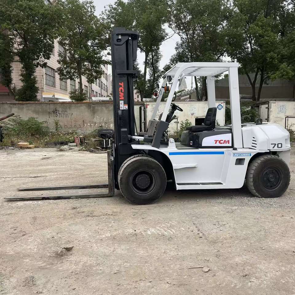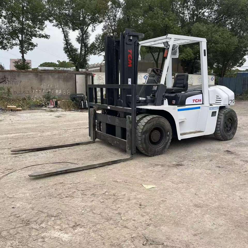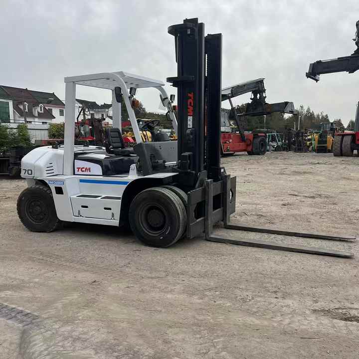 Chariots élévateurs d'occasion TCM FD70Z8 fabriqués au Japon, moteur Isuzu, fourches latérales 4m, 5m, 6m, capacité de levage 7T, équipements d'occasion d'usine.