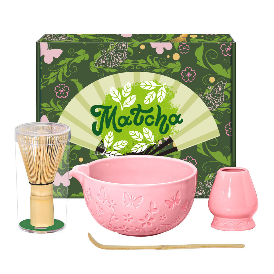 Ensemble de thé matcha japonais 4 pièces, bol en céramique et fouet en bambou avec motif papillon, ensemble traditionnel pour la cérémonie du thé matcha