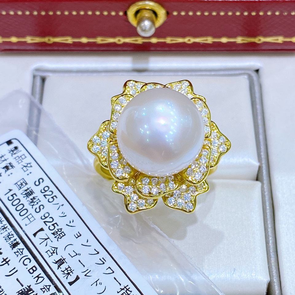 Bague en argent pur de style japonais avec perle naturelle de 12-11 mm, poudre argentée, lumière froide, lumière intense, fleur épanouie, coffret cadeau inclus