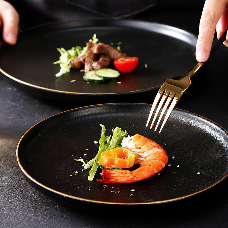 Assiettes de Dîner en Céramique Style Japonais, Assiettes à Steak Sous Glaçure, Bord Doré, Plats Ronds pour BBQ, Restaurant, Hôtel, Restauration, Vente en Gros