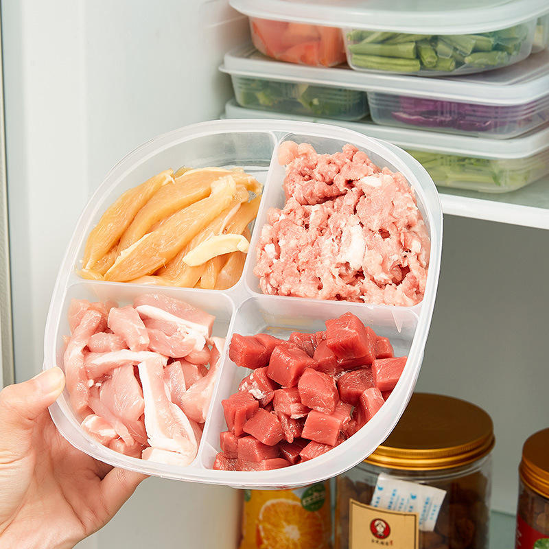Boîte de conservation alimentaire rectangulaire à quatre compartiments de style japonais avec couvercle, congelable pour viande et légumes, portable et hermétique pour réfrigérateur
