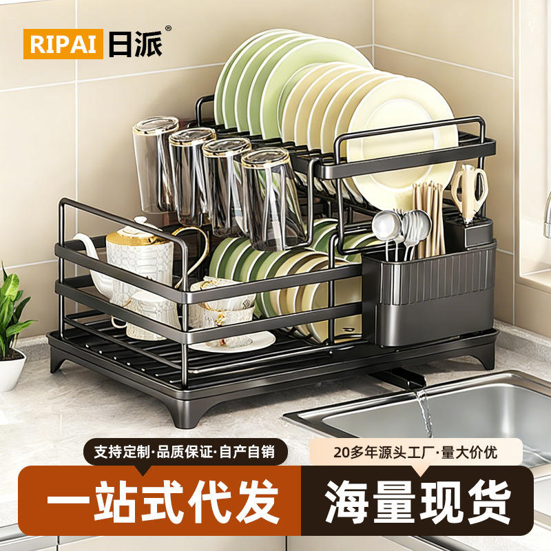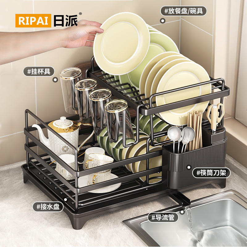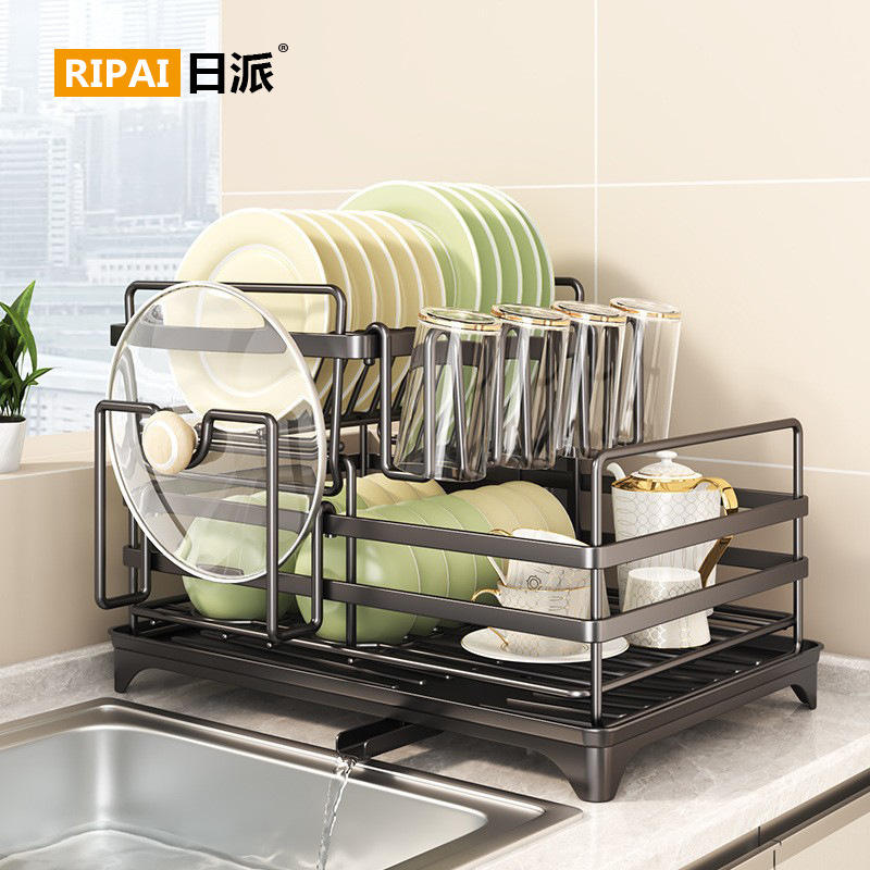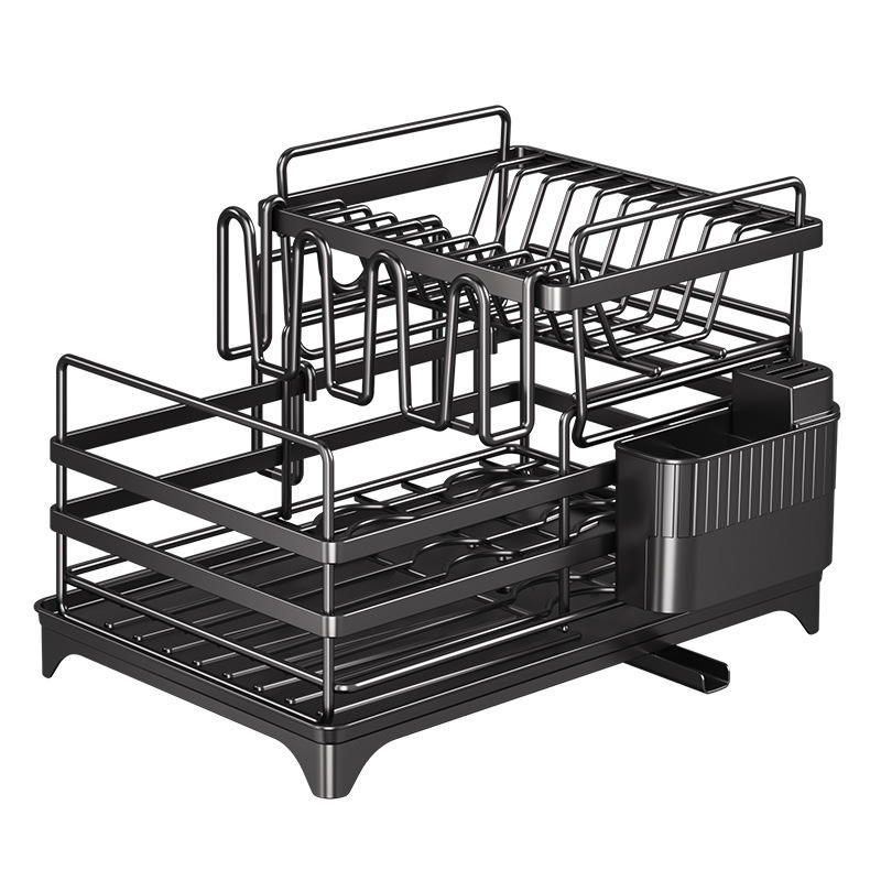 Égouttoir à vaisselle en fer forgé de style japonais, double couche avec plateau, séchage rapide, égouttoir d'évier, support de rangement de cuisine, taille L