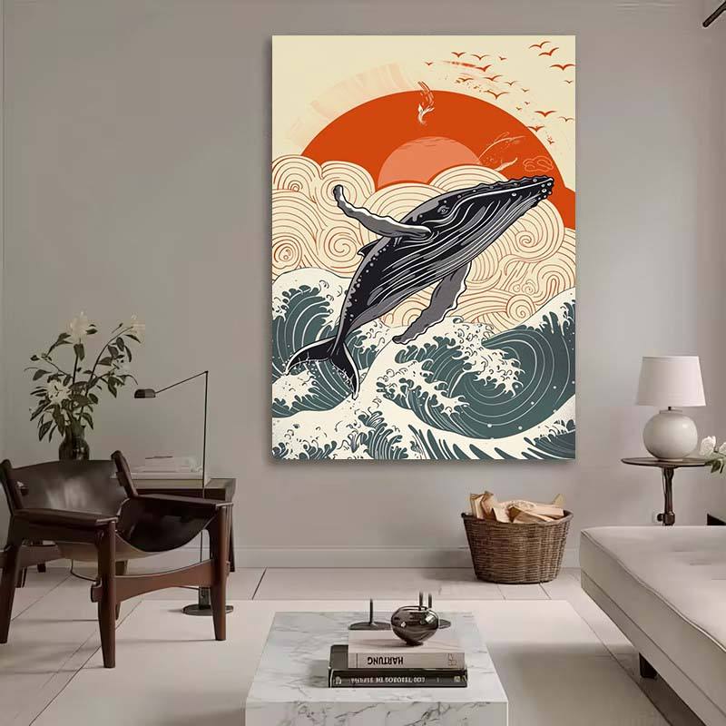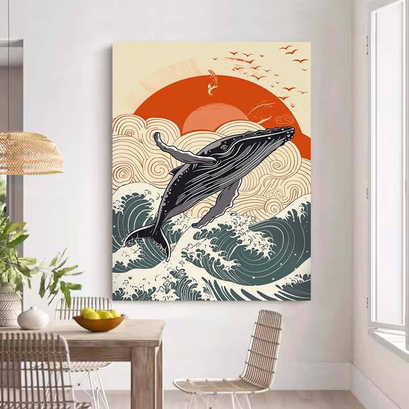 Style japonais Ukiyo-e coucher de soleil paysage marin peinture vagues de l'océan et dauphins sautant Art traditionnel décoration de la maison tenture murale