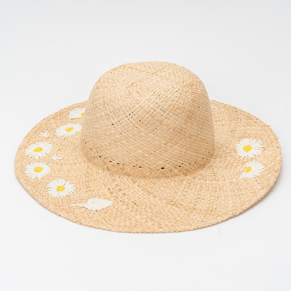 Chapeau de paille en raphia à large bord rond et plat, style japonais, motif de petites marguerites, ajouré à carreaux, pour femme, idéal pour la plage, la campagne et la ferme, protection solaire estivale