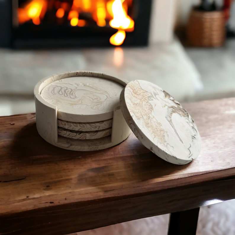 Sous-verres ronds en Jesmonite effet marbre, imperméables, flammés, grandes dalles, avec support, lot de 4 pour usage intérieur