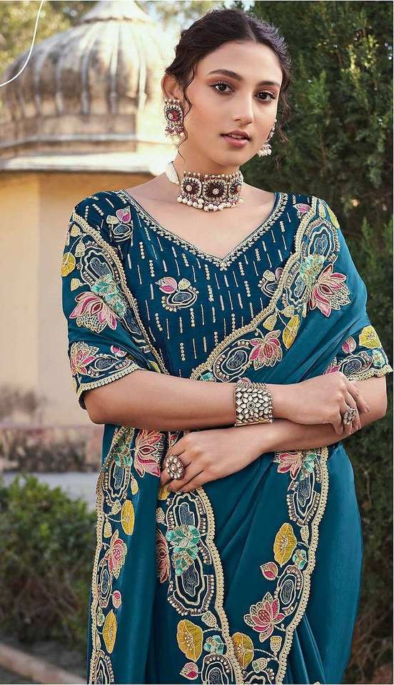 Sari traditionnel Jimmy Cho, pur et doux, broderie multi-fils lourde, bordure ajourée fantaisie, non cousu, 2 latkans, pour mariage et fête