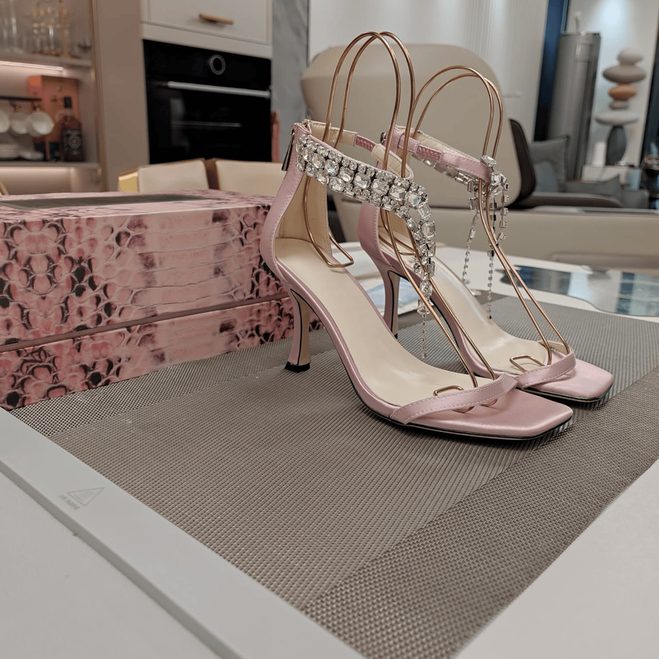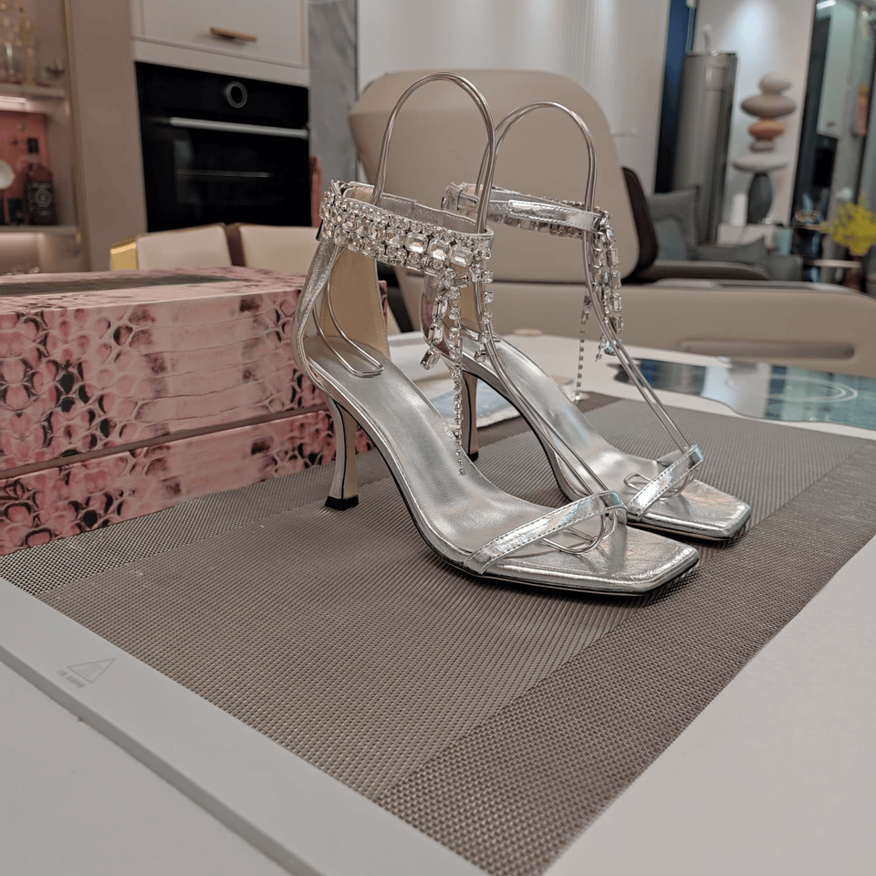 Jimmying – Sandales à talon aiguille et bout carré pour femme, en cuir noir brillant avec strass et pampilles, à bride cheville, style cool pour soirée