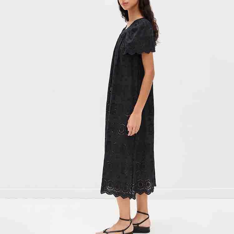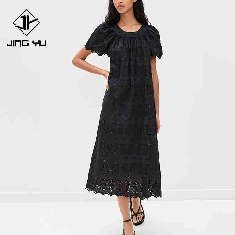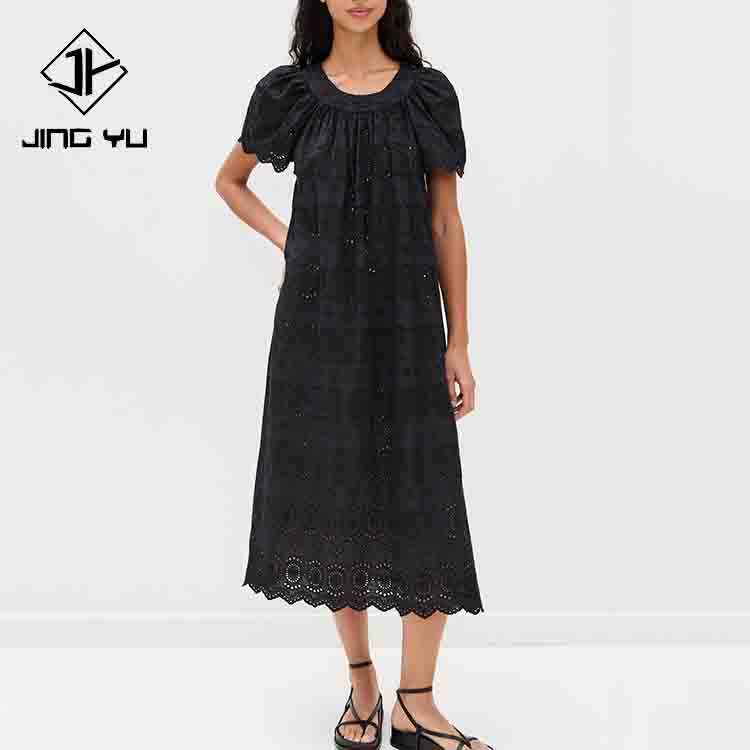 Robe de soirée décontractée brodée en forme d'éventail à col rond Jingyu, robe maxi personnalisée 100% coton