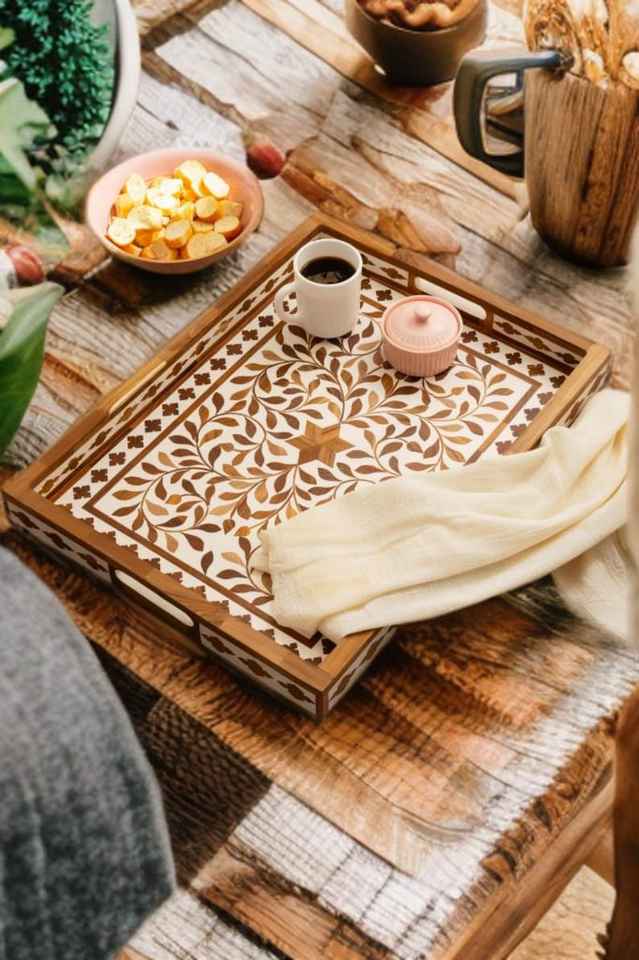 Plateau décoratif rectangulaire en bois d'Inde avec incrustations, motif floral marron, plateau d'appoint indien avec incrustations en os, décoration de table basse