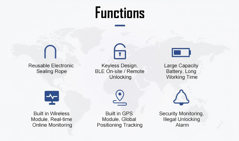 Télécommande, Double Mode système de Navigation, Conception anti-vol, Antipoussière et imperméable: IP67, Unité principale réutilisable, Avis de décachetage, Suivi de position en temps réel, Module intégré de communication 2G/3G/4G, Statistiques du nombre de phoques, Alarme d'événement anormaleFonction