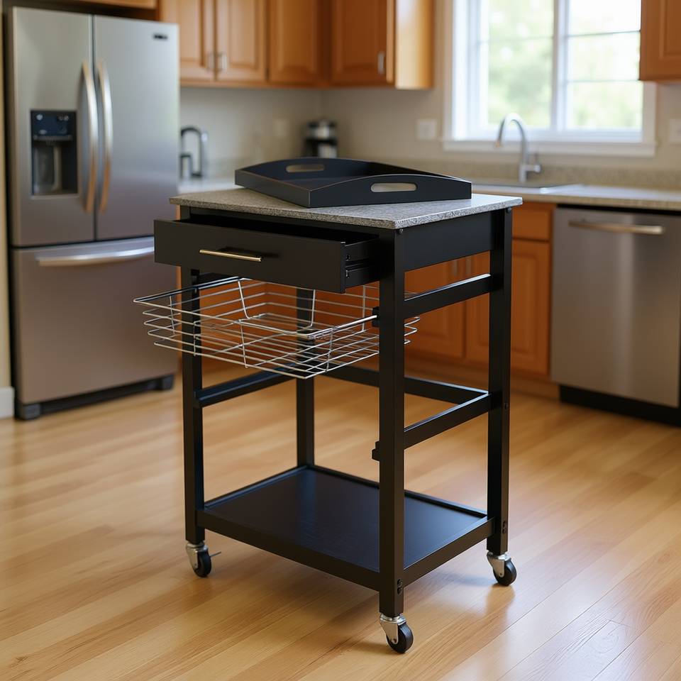 Chariot de cuisine Julia en métal, 1 tiroir, 2 étagères avec roulettes, chariot de rangement moderne pour la cuisine