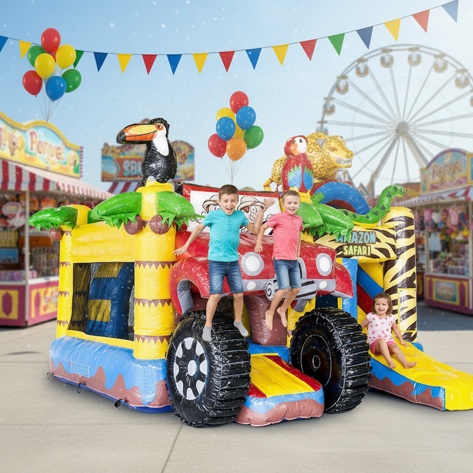 Château gonflable d'aventure dans la jungle avec toboggan, château de saut pour enfants en plein air, décoration animale, design de véhicule tout-terrain