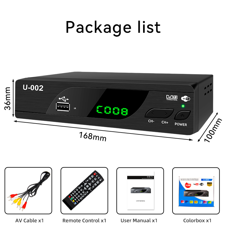 Accessories:1*RCA Cable+1*Remote Control+1*User Manual+1*Colorbox