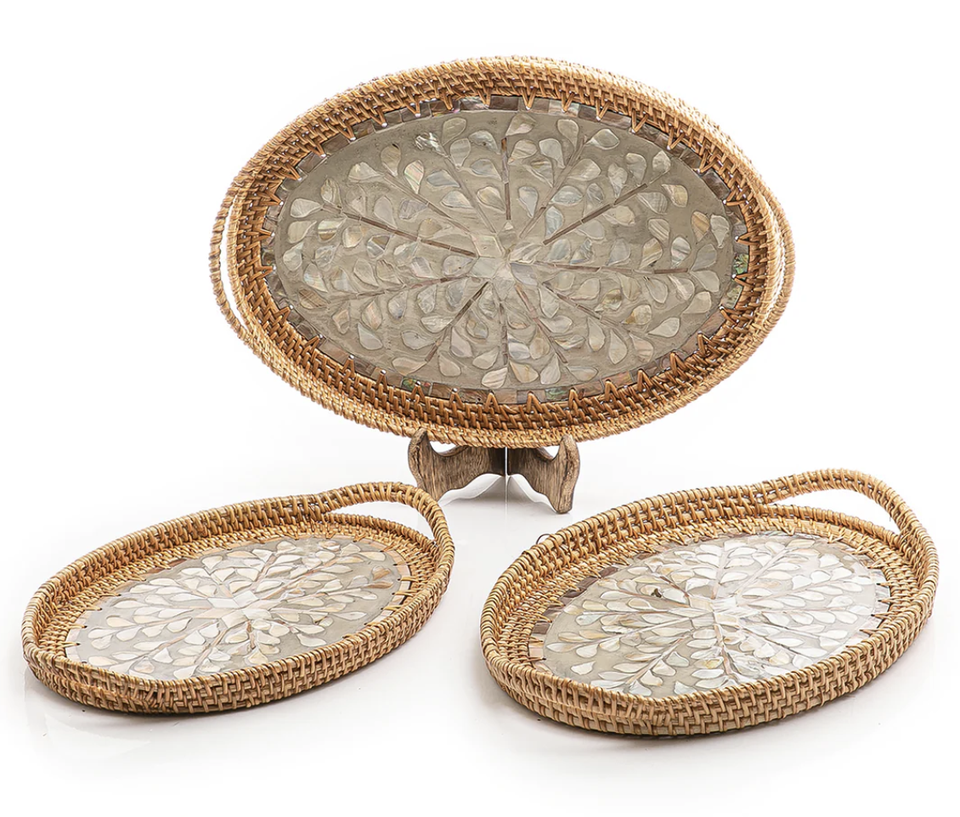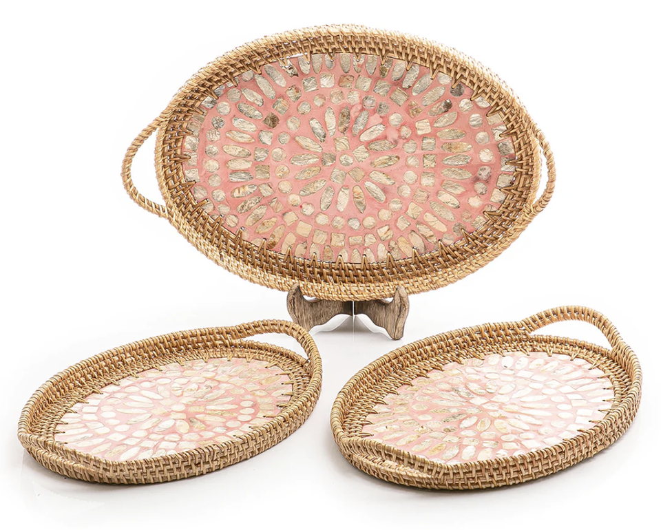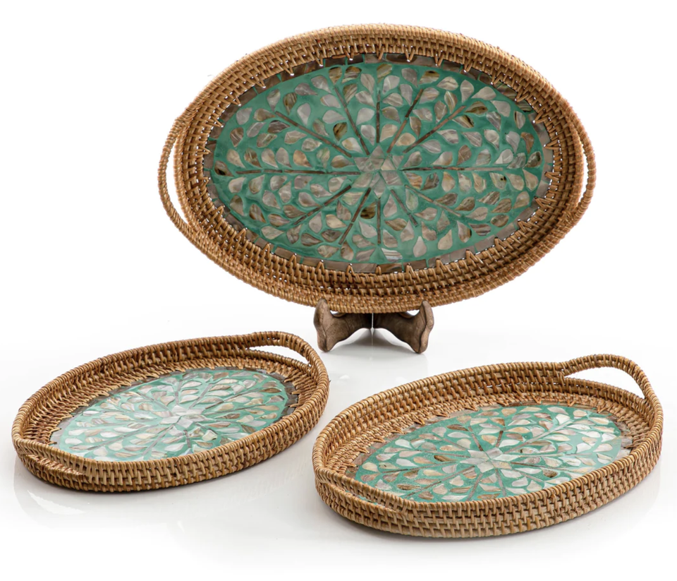 Jute fait à la main décoratif rotin plateau de service os incrustation finition 2 forme arrondie alimentaire Dessert herbe serveur plateau ensemble