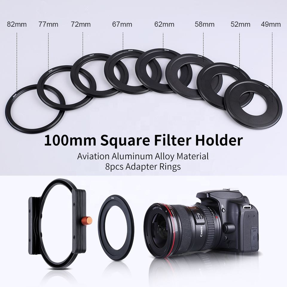 Porte-filtre carré K&F Concept 100 mm de large, 2 mm d'épaisseur avec anneau adaptateur 52 mm/58 mm/62 mm/67 mm/72 mm/77 mm/82 mm