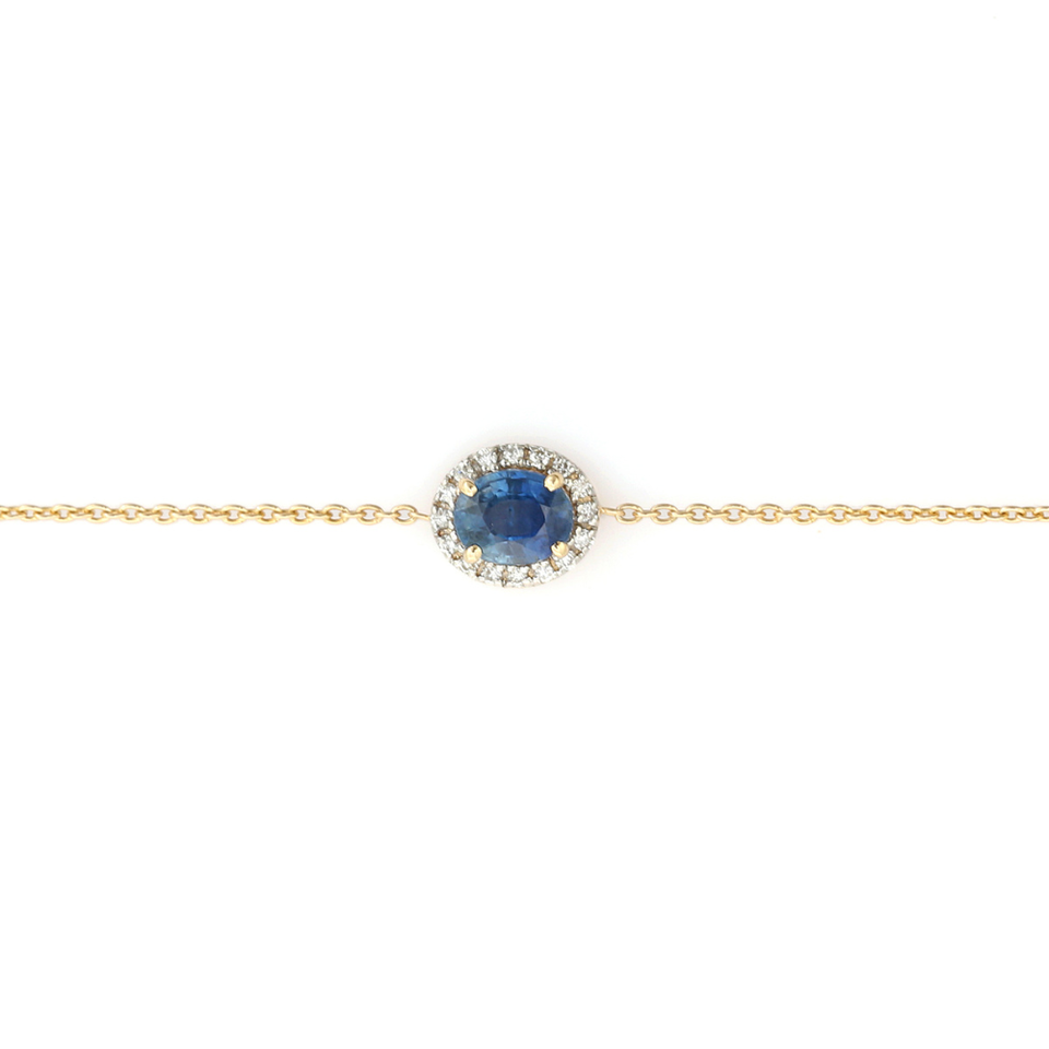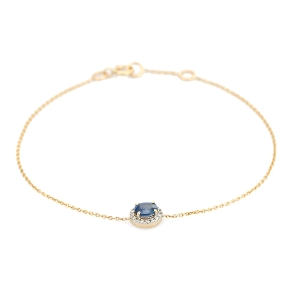 Bracelet solitaire délicat en or jaune K14 avec saphir bleu de forme ovale et diamant taille ronde, bijou pierre de naissance de septembre