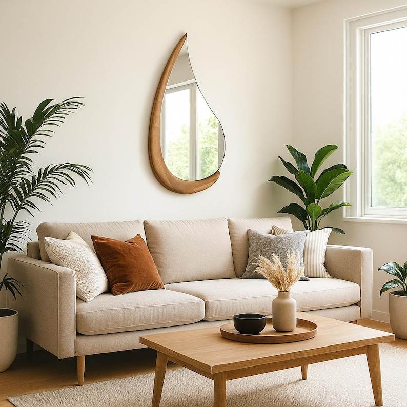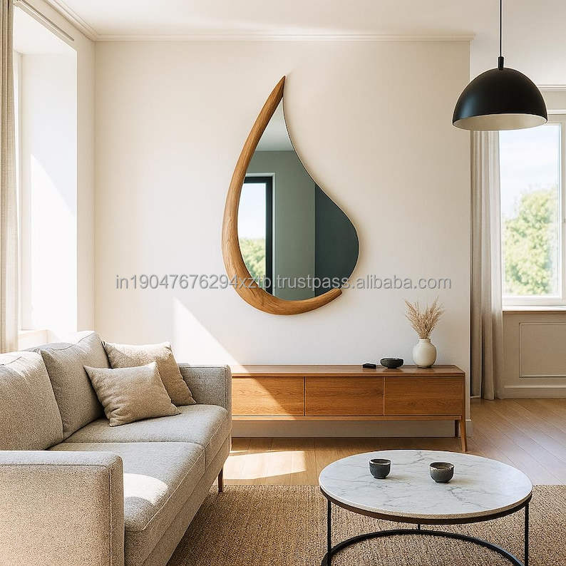 Miroir mural Art Déco Goutte d'eau unique KALATRI en bois massif fait main, écologique, décoration moderne pour la maison
