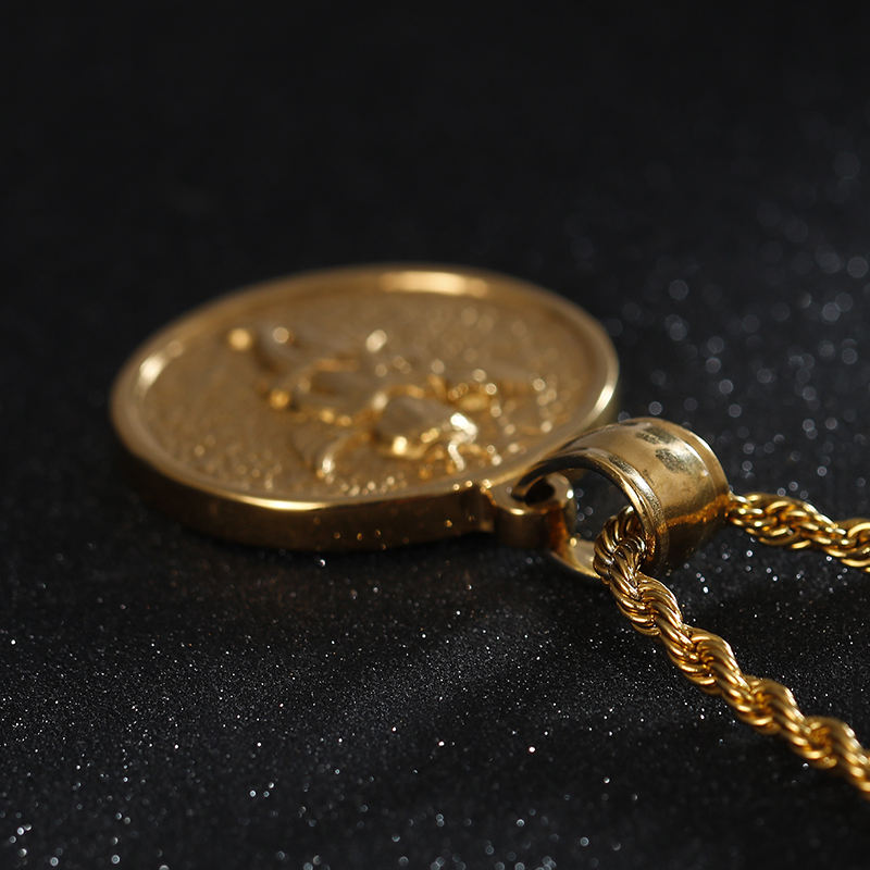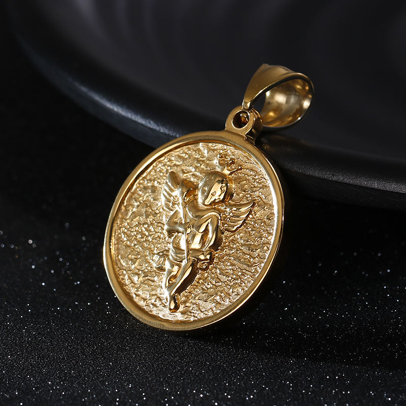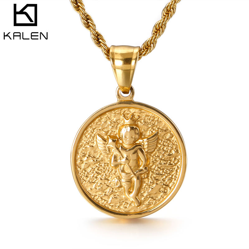 Collier KALEN de haute qualité avec pendentif rond en forme de petite personne avec couronne et ailes en acier inoxydable