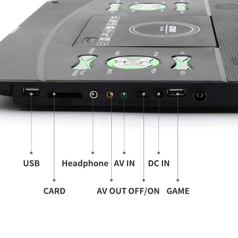 Lecteur DVD portable KCR avec écran de 13,3 pouces, batterie rechargeable, USB, TV et jeux