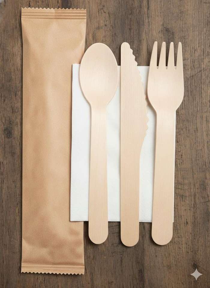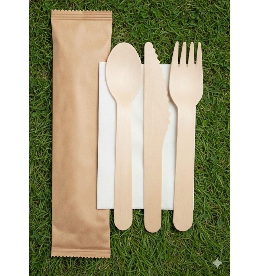 Ensemble de couverts jetables KEGO écologiques et biodégradables 100% en bois de magnolia conifera, 10 pièces (cuillère, fourchette, couteau, serviette en papier)