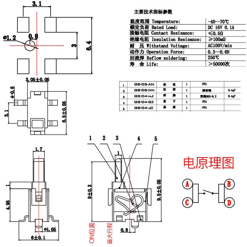 Zoyusn KFC-WT-05D Interrupteur de détection de fin de course 8,7 mm 6,5x3mm 4 broches CMS à poussoir pour appareils électroménagers