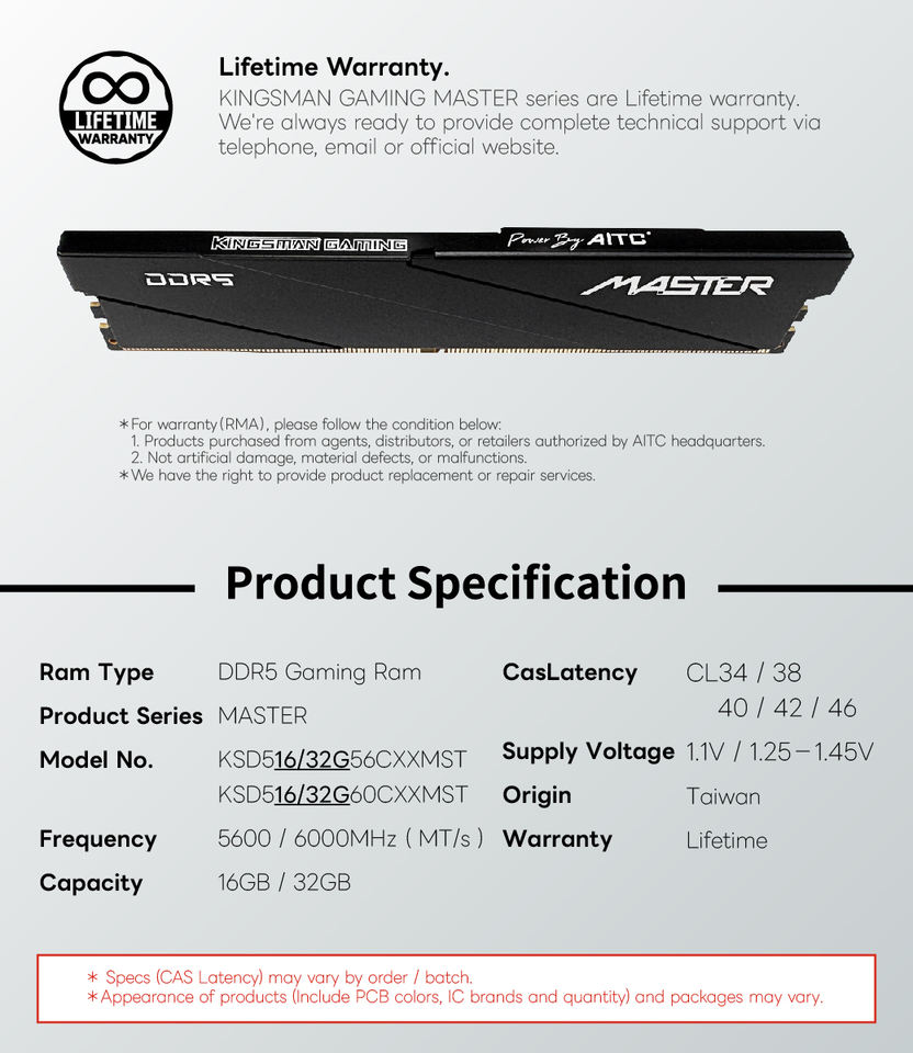 [KINGSMAN AITC] RAM de bureau DDR5 16 Go (2x8 Go) 6000 MHz CL38-46 surclocké avec garantie à vie en stock