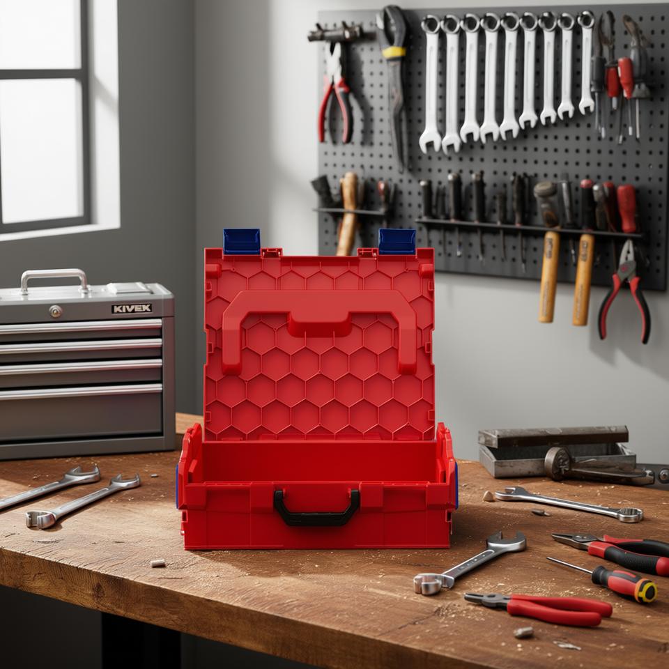 Boîte à outils KNIPEX L-BOXX en plastique rouge avec loquets et poignée bleus pour le rangement et le transport d'outils
