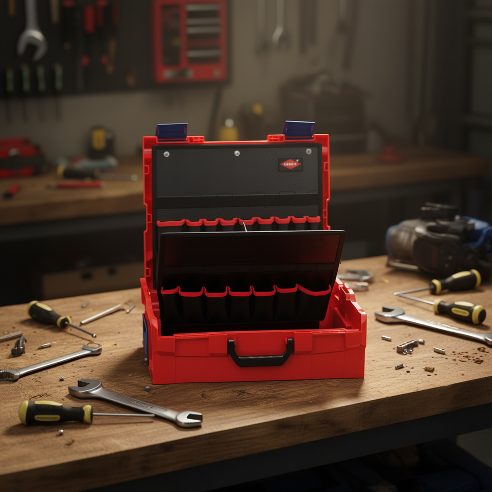 Boîte à outils KNIPEX L-BOXX en plastique rouge avec compartiments organisateurs pour le rangement et le transport