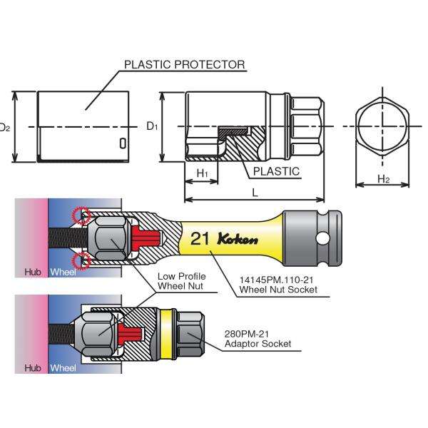 KOKEN - 280PM-19 Douille d'adaptation pour écrous de roue à profil bas-EAN 4991644000463 ACCESSOIRES DE CLÉ À DOUILLE 1/4
