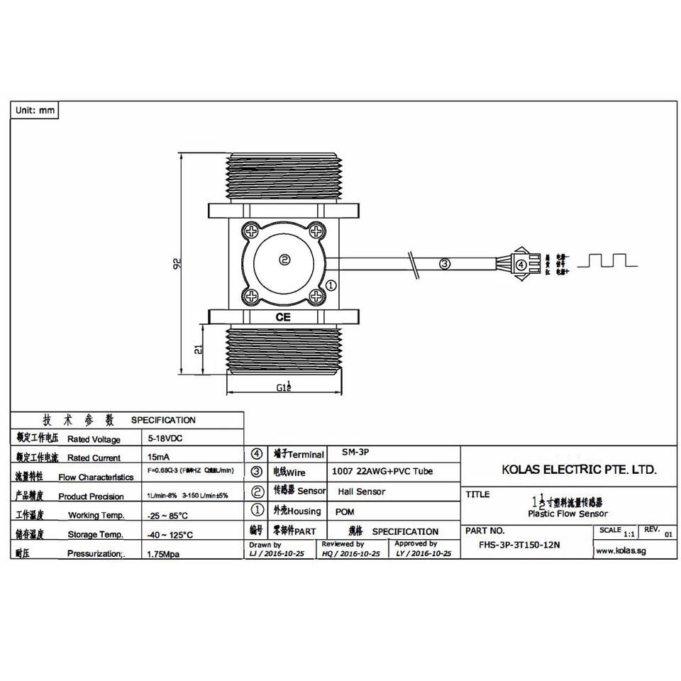 Débitmètre d'eau magnétique à effet Hall KOLAS FHS-3P-3T150-DN40 avec rotor en POM, DN40, sortie impulsionnelle, 3-150 LPM