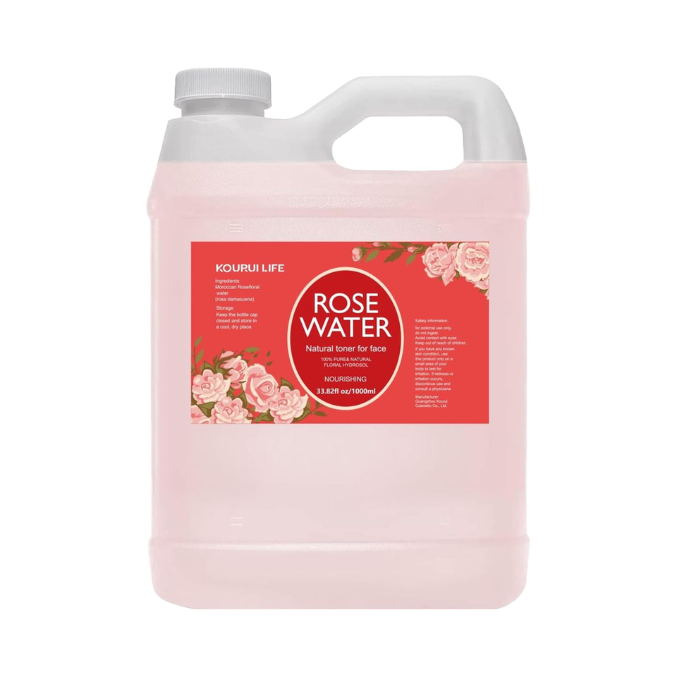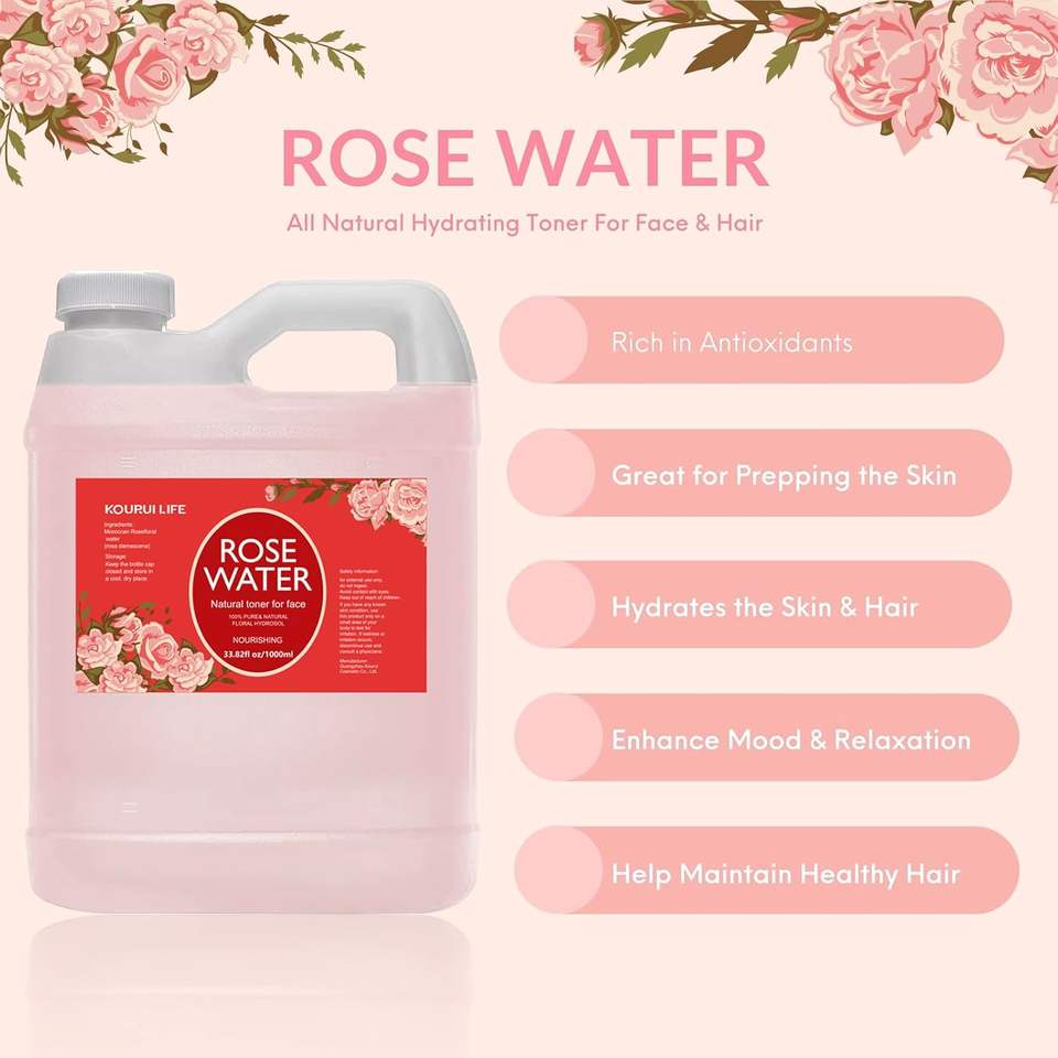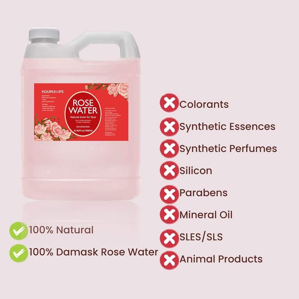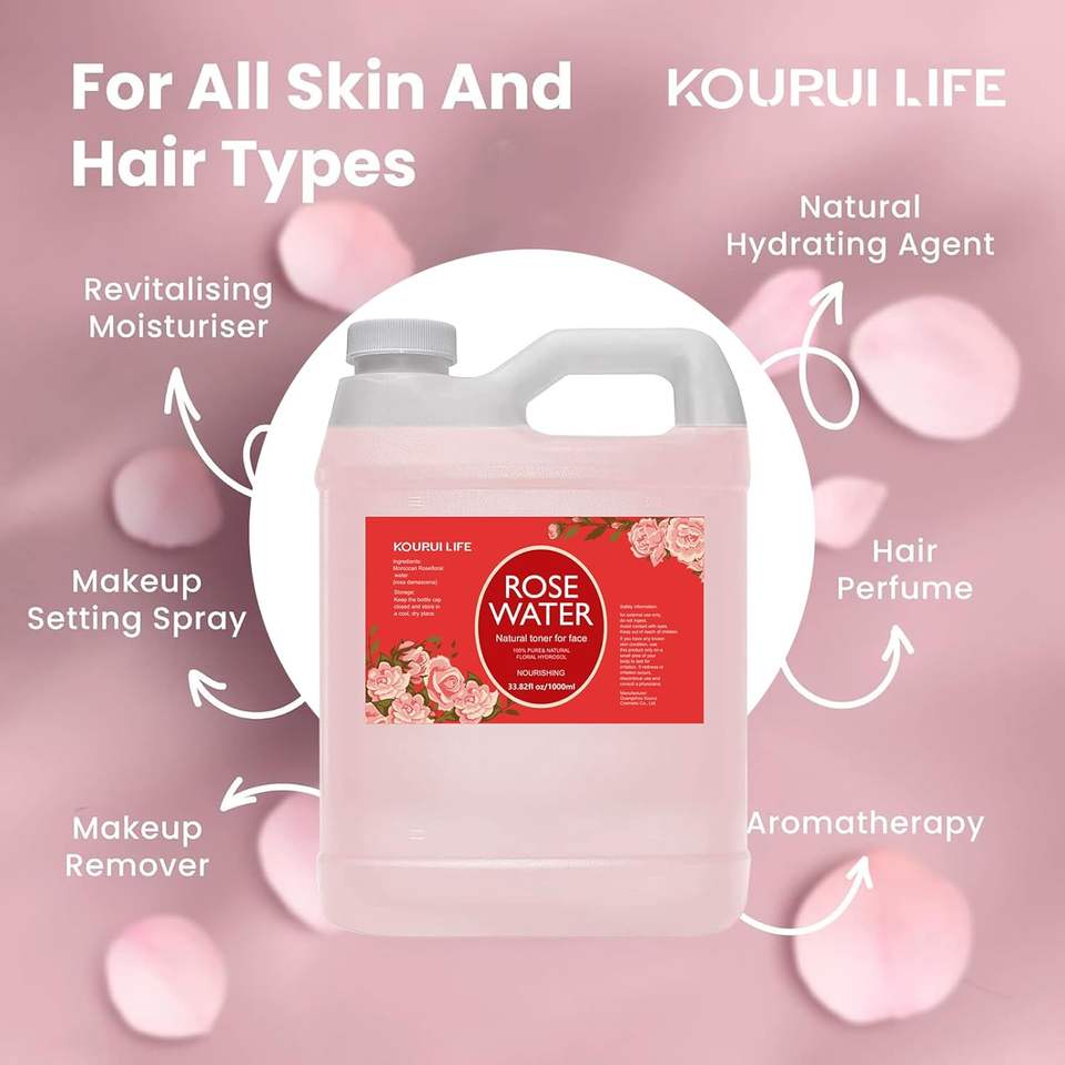 KOURUILIFE-Eau de Rose Naturelle Pure, 1000 ml, Extrait de Rose 100% Pure, Hydrate, Eau Comestible pour le Visage, Corps et Cheveux