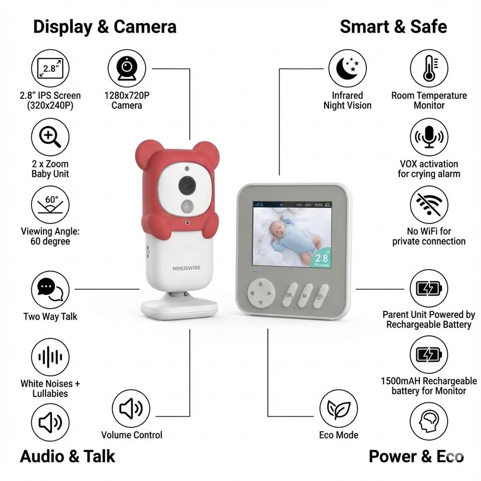 Moniteur bébé KT-903S avec écran IPS 2,8 pouces, vidéo HD 1080P, audio bidirectionnel, détection de mouvement, batterie rechargeable, longue portée 2,4 GHz FHSS